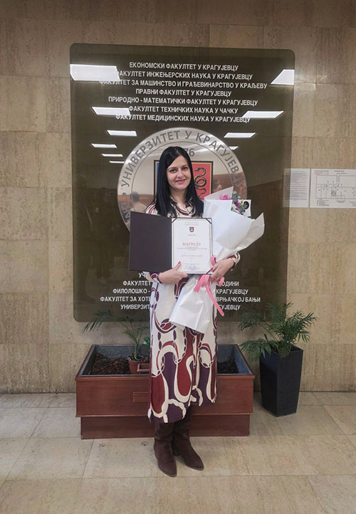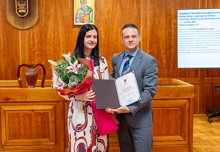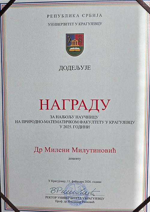 Овогодишња добитница награде са Природно-математичког факултета је др Милена Милутиновић, доцент на Институту за биологију и екологију.